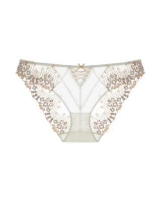 Surround your bottom with layers of Swiss tulle and embroidery. The Joyeau Eternel Italian Brief is crafted with panels of luxurious dotted tulle and satin, with shimmer threads weaved in the front for a sophisticated look. The rear is complemented with satin lacing detail. Scalloped edges along the edges offer full coverage with a dainty ribbon bow.
