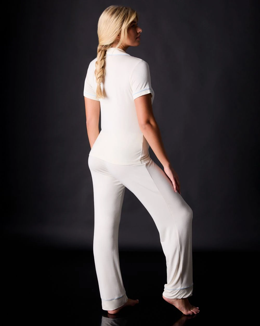 The Lilly Short Sleeve & Pant Pajamas are a luscious pajama set designed to keep you wrapped in a cloud of comfort all day long. Short and sweet top to let your skin breathe and long pants to keep you warm, making this the best of both worlds. Completed with bold contrast piping as an added detail. An elevated staple for your loungewear wardrobe.