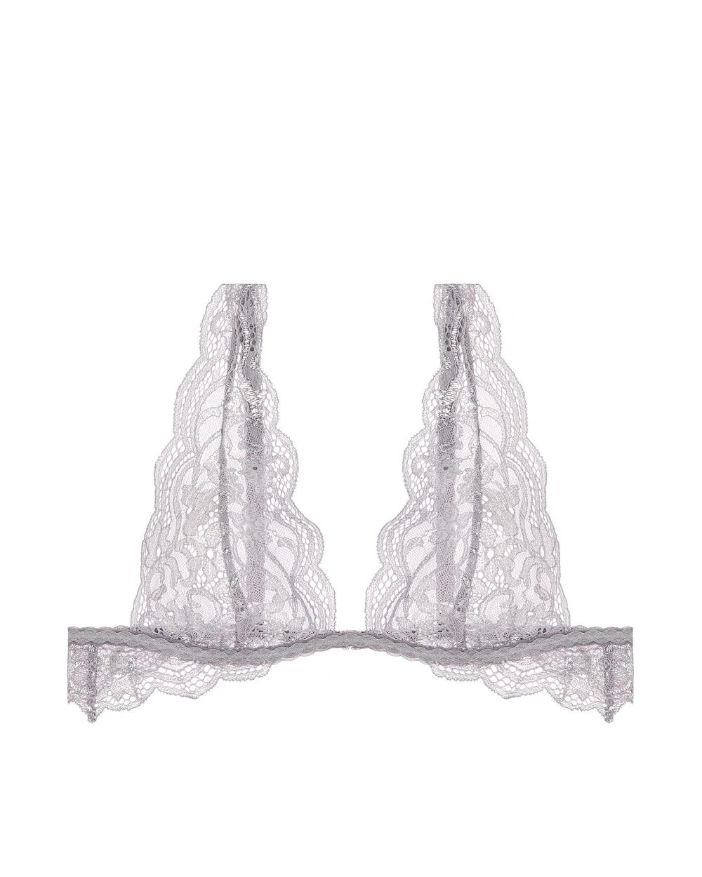 - Unlined triangle bralette with lace peeking under the band on sides.