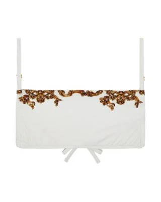 A classic bandeau in the front with a nearly backless silhouette and slightly revealing sides make this swim top ideal for smaller-chested figures. Adjustable straps, tie-back closure, and ruched side seams.